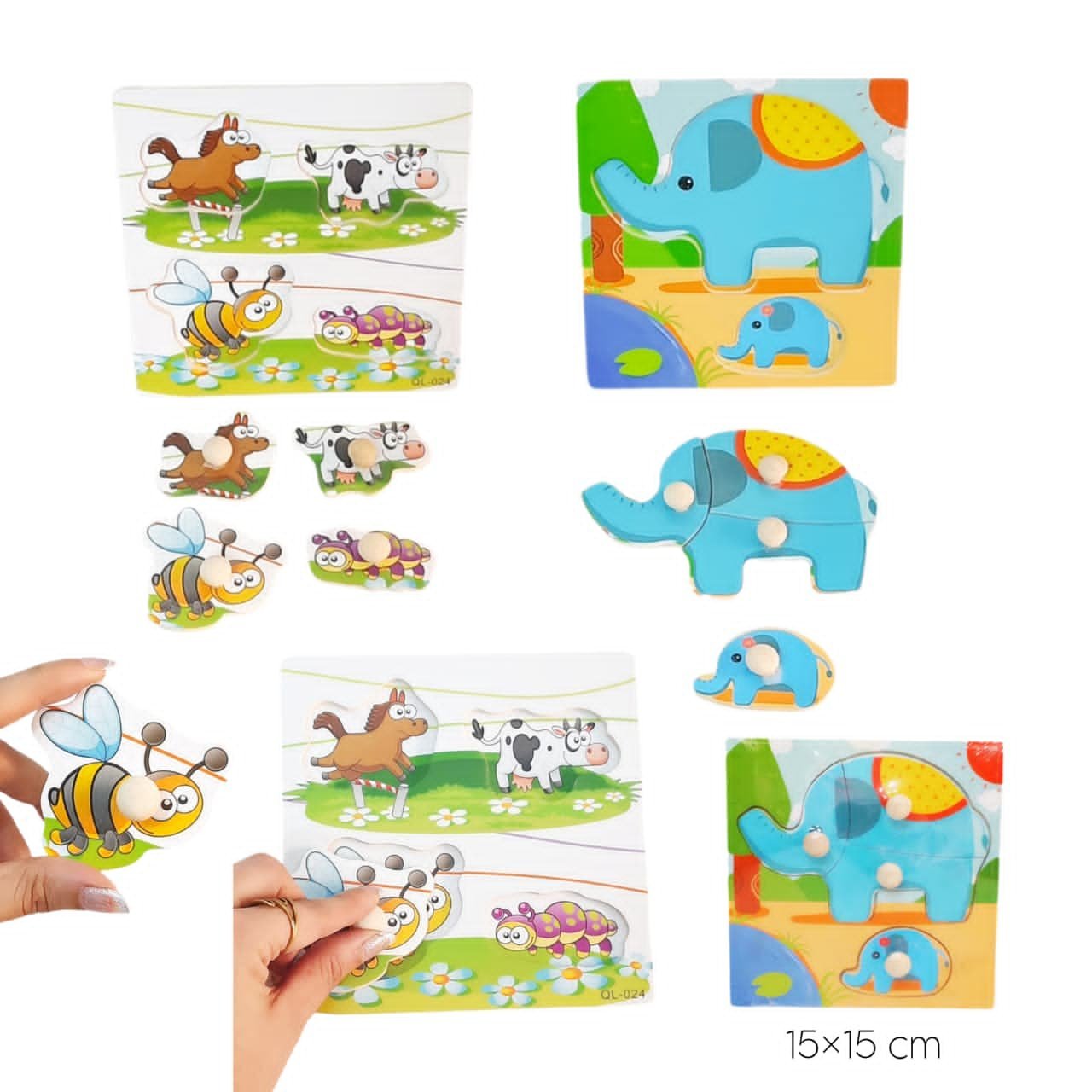 كل قطعة فيها مقبض صغير يساعد الطفل على التحكم بها بسهولة وينمي عنده التركيز والتنسيق بين العين واليد